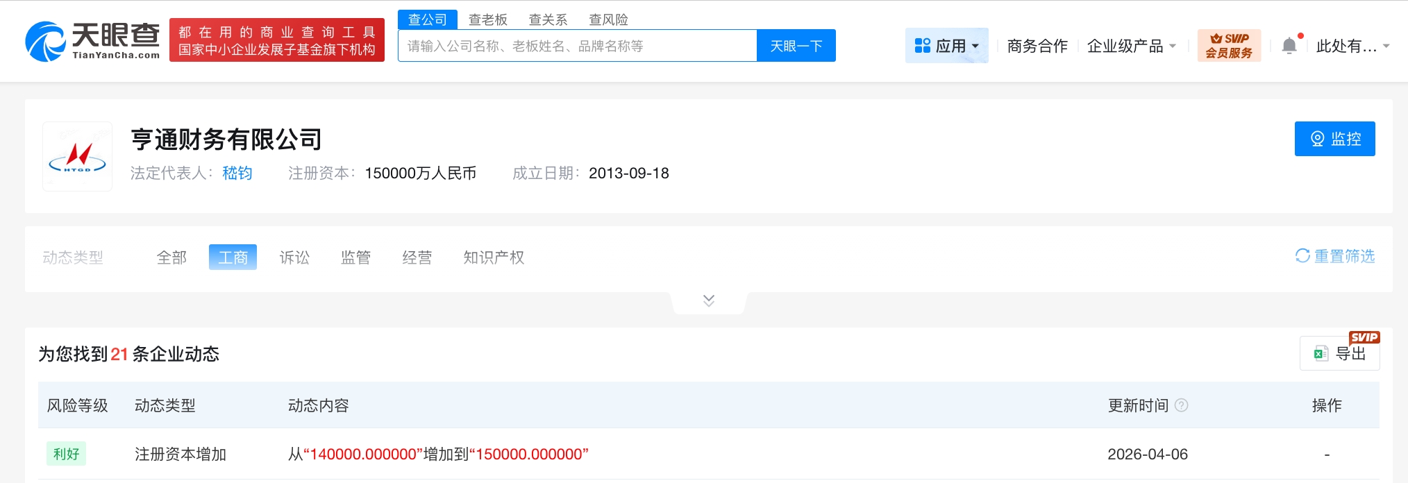 天眼查App显示,近日,亨通财务有限公司发生工商变更,注册资本由14亿人民币增至15亿人民币,增幅约7%.