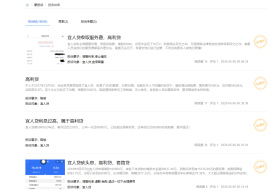 “数金观察”记者登录聚投诉平台发现,截至5月6日,宜人贷的相关投诉帖数量高达10000条,其中多为高额服务费、暴力催收、套路贷、砍头息等相关问题。