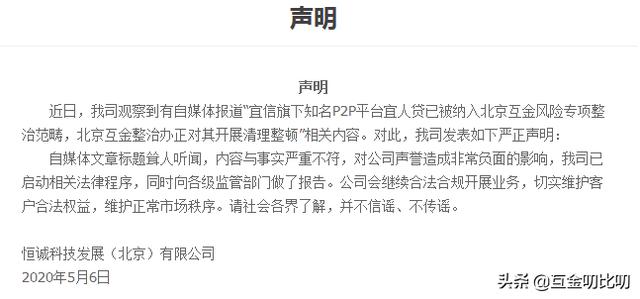 5月6日,据自媒体文章报道称,宜信旗下知名P2P平台宜人贷已被纳入北京互金风险专项整治范畴,北京互金整治办正对其开展清理整顿。对此,宜人贷方面公告称,自媒体标题耸人听闻,内容与事实严重不符,对公司声誉造成非常负面的影响。公司已启动相关法律程序,同时向各级监管部门做了报告。公司会继续合法合规开展业务,切实维护客户合法权益,维护正常市场秩序。请社会各界了解并不信谣、不传谣。