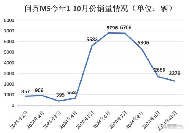 但是问界M5均售价在25万左右,销量并没有那么理想,要知道,这可是问界M5的第二次改款上市了,在今年四月份完成上市,大家都还很看好问界M5,今年5-8月份销量均超5000辆,但9月份销量腰斩至2686辆,10月份销量再度下滑至2278辆。