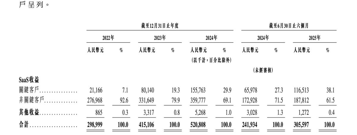 SaaS生意的核心,是做透KA客户,招股书里,小鹅通提到,2022年到20024年全年,以及2025年的前六个月,小鹅通的关键客户数分别为,266名、801名、1,421名 及1,838名。