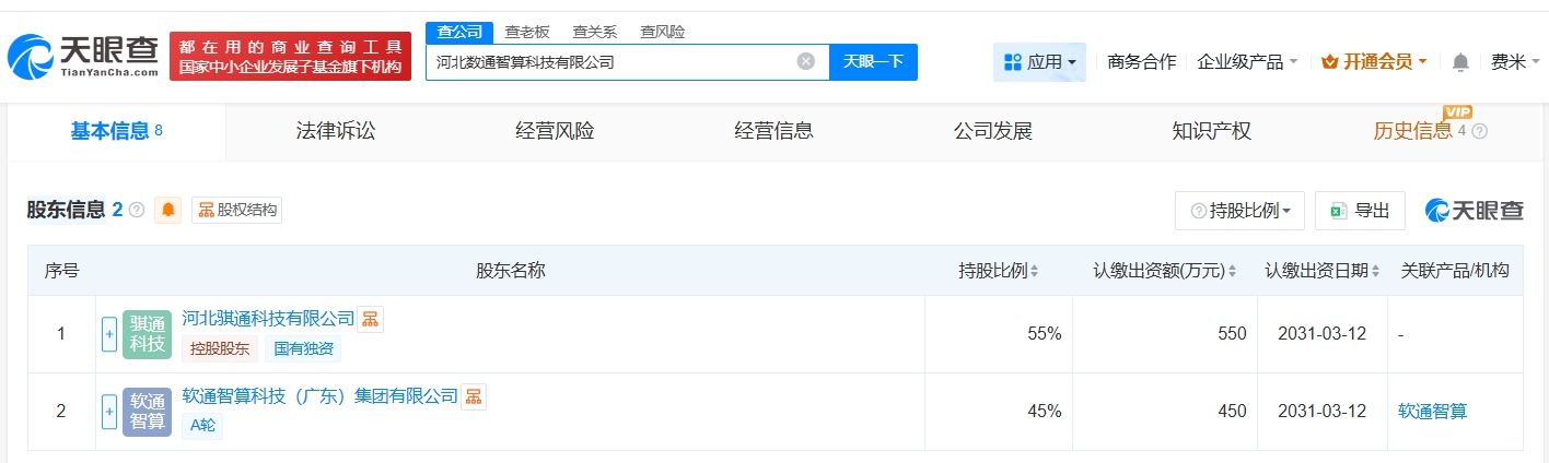 天眼查App显示,近日,河北数通智算科技有限公司成立,法定代表人为曹伟,注册资本1000万人民币,经营范围包括数据处理和存储支持服务、人工智能公共数据平台、云计算装备技术服务等。股东信息显示,该公司由河北骐通科技有限公司、软通动力(301236)旗下软通智算科技(广东)集团有限公司共同持股。