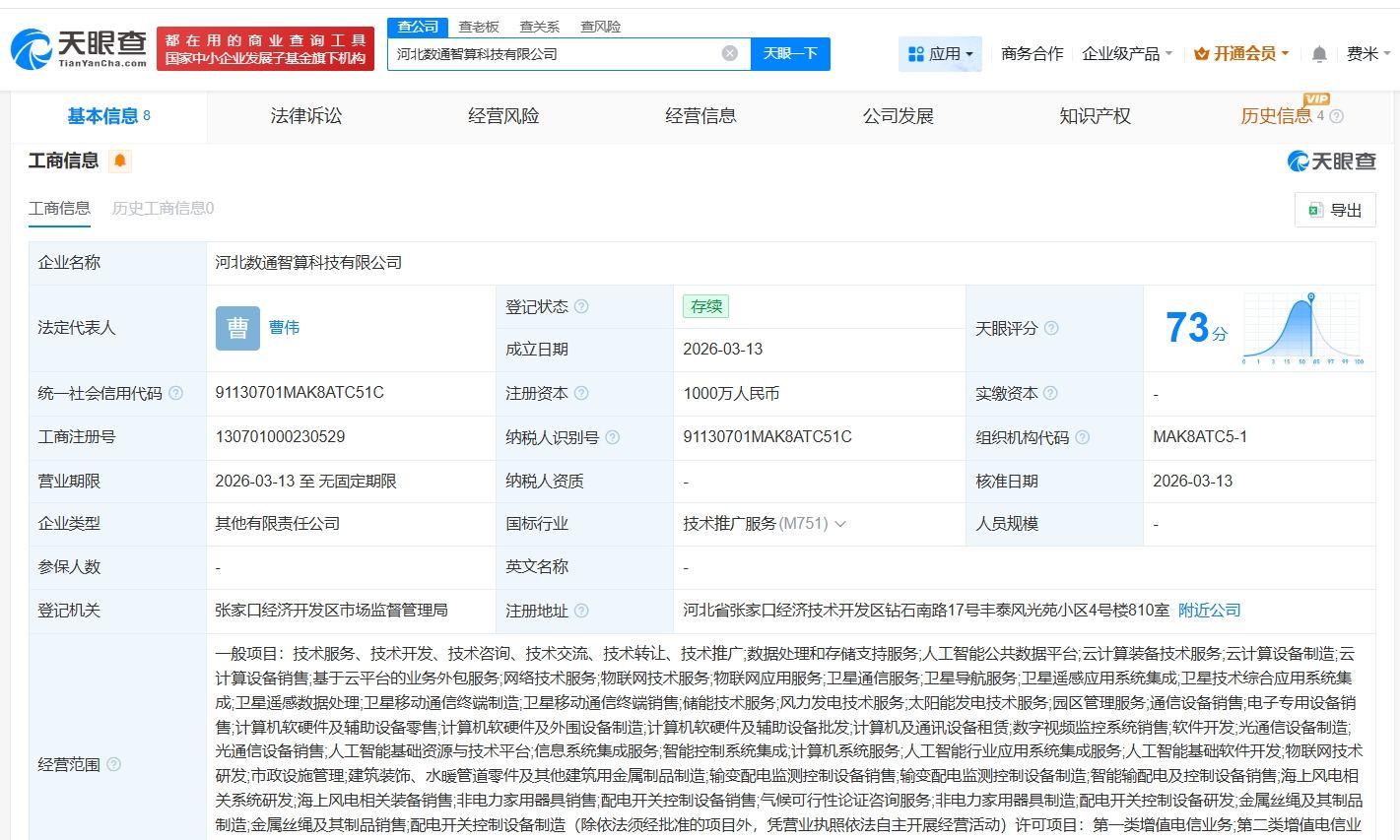 天眼查App显示,近日,河北数通智算科技有限公司成立,法定代表人为曹伟,注册资本1000万人民币,经营范围包括数据处理和存储支持服务、人工智能公共数据平台、云计算装备技术服务等。