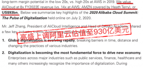 高盛认为,阿里云将持续保持高速增长,保守估计FY2022营收达834亿元。KeyBanc也在最新报告中大幅上调阿里云估值,分析称疫情正在加速企业数字化进程,这将极大提高阿里云的发展潜力。数据显示,阿里云亚太市场占有率第一,份额是亚马逊和微软总和,上一财年营收同比增长62%至400亿元。
