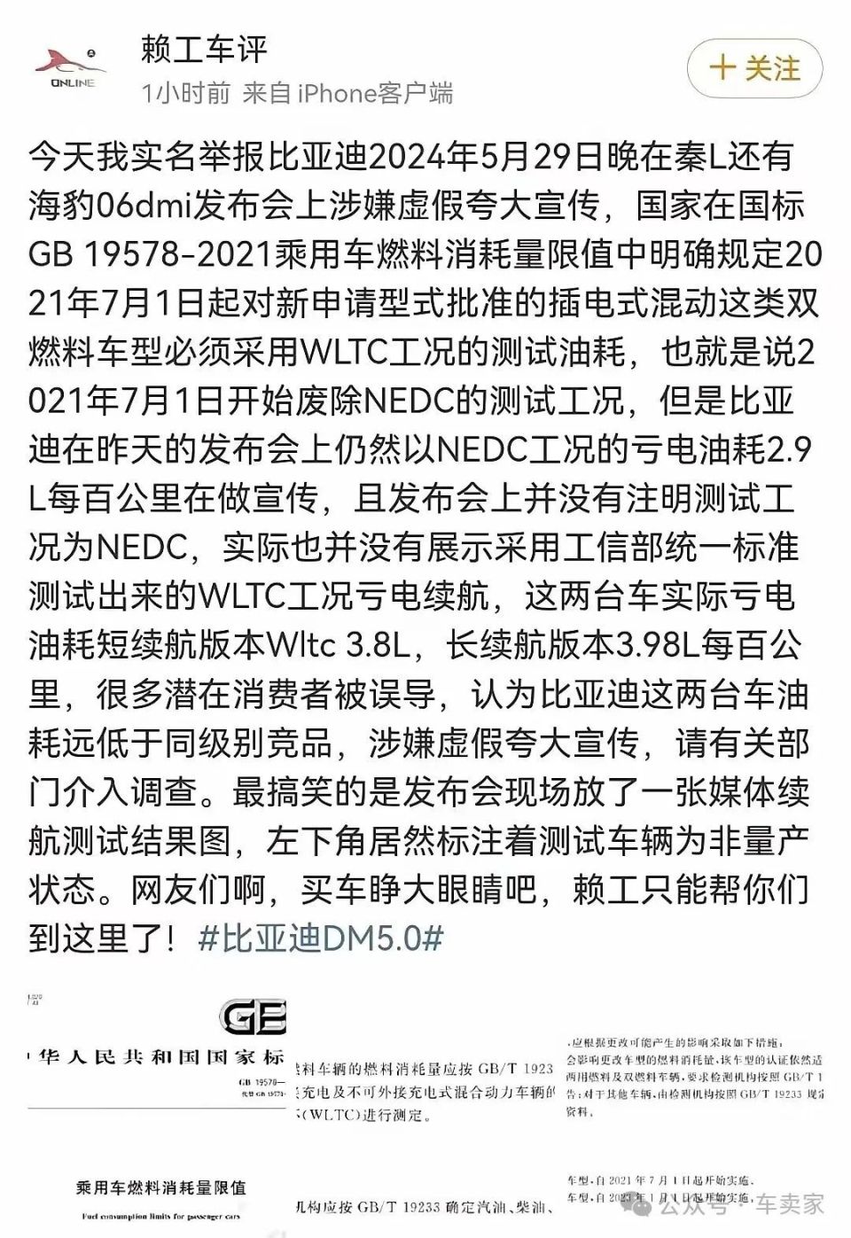 昨天有车评人对比亚迪的宣传进行了举报,举报的大致内容其实就是说比亚迪夸大宣传,因为国家已经规定以后能耗必须用WLTC,而比亚迪秦L上市发布会上比亚迪依然用NEDC标称自己的能耗,这个需要比亚迪进行回复吧!另外就是比亚迪展示了一些媒体测试的续航里程,估计有些人看完觉得真的非常厉害,但是其实又标注了一行小字,写的是“测试车非量产状态,车辆以上市状态为准”!那既然不是量产车状态那呈现出来这些续航有什么意义呢,这个比亚迪是否也需要回应一下这位车评人呢。