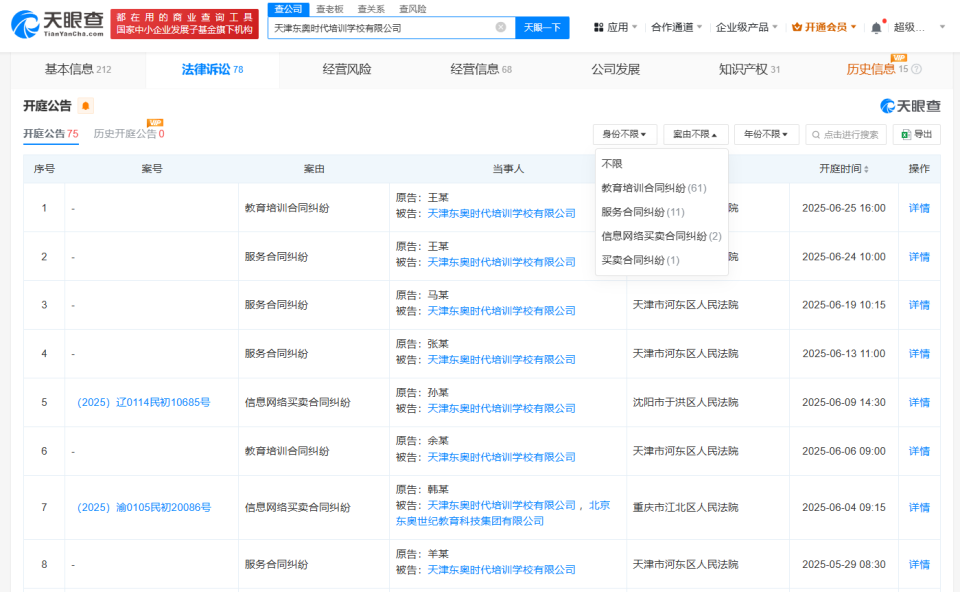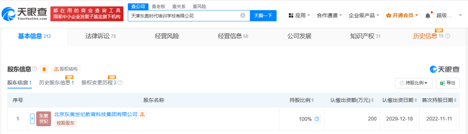 天眼查App显示,天津东奥时代培训学校有限公司成立于2020年12月,法定代表人为邓炜,注册资本200万人民币,经营范围包括营利性民办自学考试助学教育机构、出版物零售、出版物批发等,由北京东奥世纪教育科技集团有限公司全资持股。天眼风险信息显示,该公司涉及多个教育培训合同纠纷、服务合同纠纷。