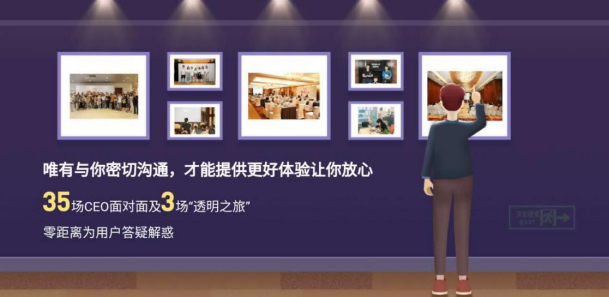 面对行业寒冬考验,积极主动与用户进行沟通,践行“透明化运营”方针也是爱钱进过去一年的主修课程。一年间,爱钱进开展了“CEO面对面”线上活动35场;线下在北京、上海、深圳举办爱钱进“透明之旅”用户见面会3场,面对面解答用户疑惑,主动将爱钱进的运营状况与用户进行分享,以行动打造透明可信赖的互金品牌。