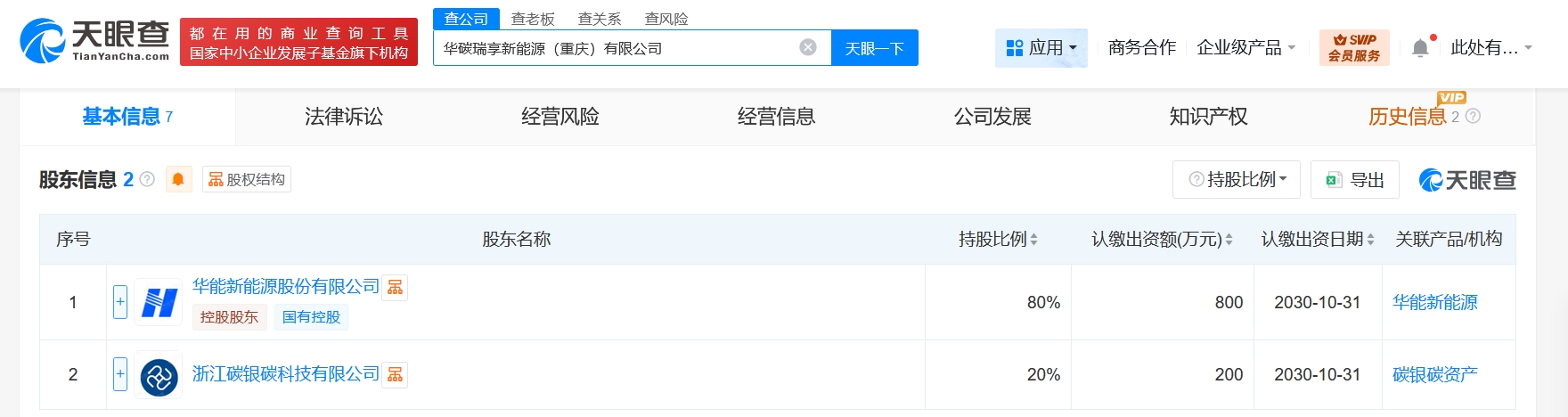 天眼查App显示,近日,华碳瑞享新能源(重庆)有限公司成立,法定代表人为刘宇,注册资本1000万人民币,经营范围含发电业务、输电业务、供(配)电业务,太阳能发电技术服务,风力发电技术服务,新兴能源技术研发,工程管理服务,信息系统运行维护服务等,由华能新能源股份有限公司、浙江碳银碳科技有限公司分别持股80%、20%。