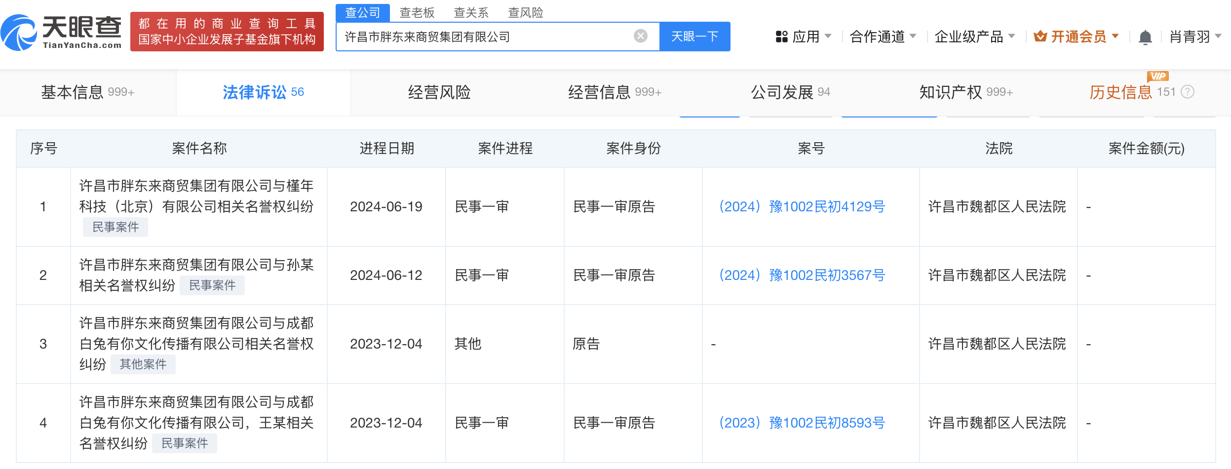 天眼查App显示,许昌市胖东来商贸集团有限公司曾经多次发起名誉权纠纷诉讼,被告包括槿年科技(北京)有限公司、成都白兔有你文化传播有限公司等。