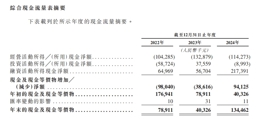 值得关注的是,五一视界的经营活动现金流持续为负,显示其主营业务尚未建立起稳定的“造血”机制。招股书显示,2022年至2024年,公司经营活动所用现金净额分别为1.04亿元、1.33亿元和1.14亿元,三年合计净流出超过3.5亿元人民币,无一年实现正向回流。