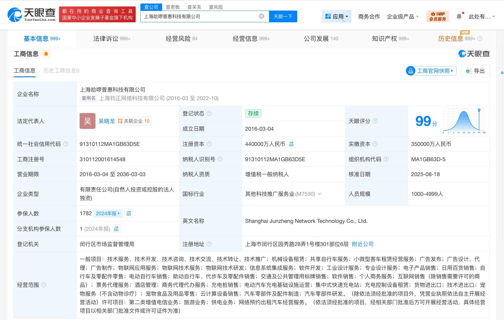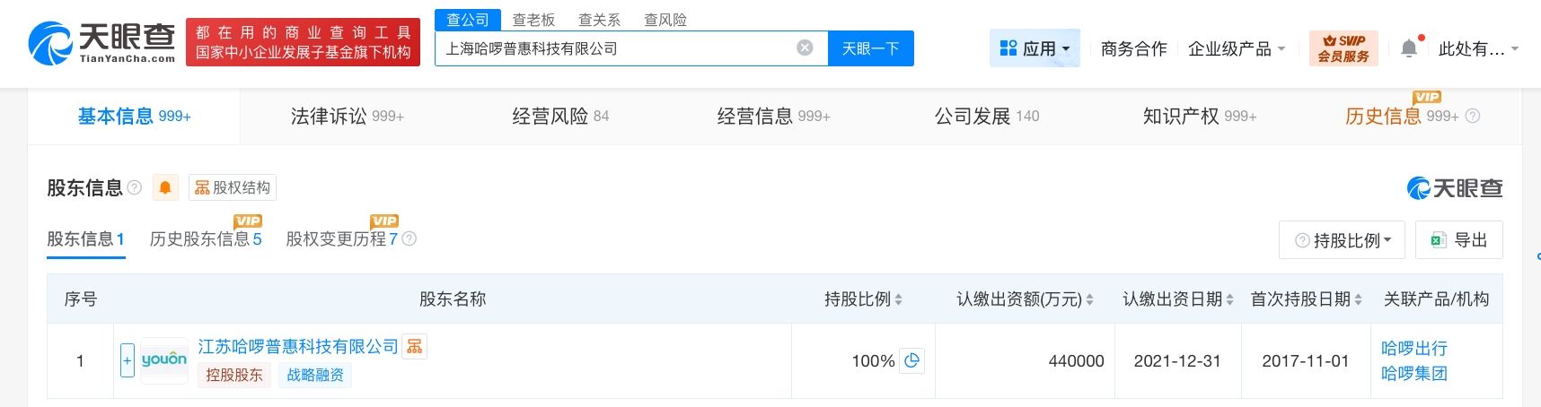 上海哈啰普惠科技有限公司成立于2016年3月,法定代表人为吴晓龙,注册资本44亿人民币,经营范围含机械设备租赁、共享自行车服务、小微型客车租赁经营服务、信息系统集成服务、软件开发、工业设计服务、互联网销售等,由江苏哈啰普惠科技有限公司全资持股。