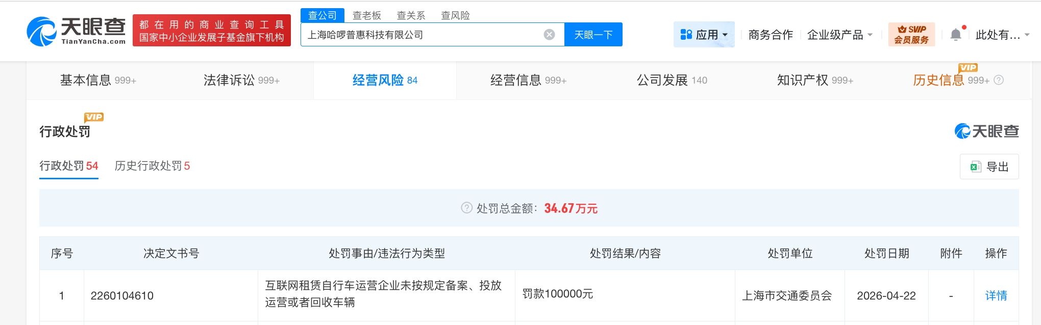 天眼查App显示,近日,上海哈啰普惠科技有限公司因互联网租赁自行车运营企业未按规定备案、投放运营或者回收车辆,被上海市交通委员会罚款10万元。