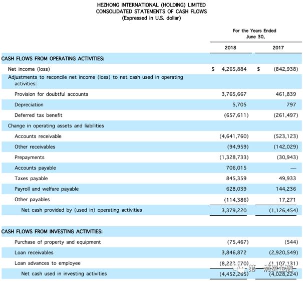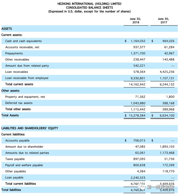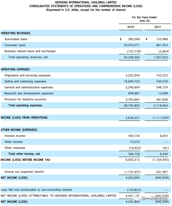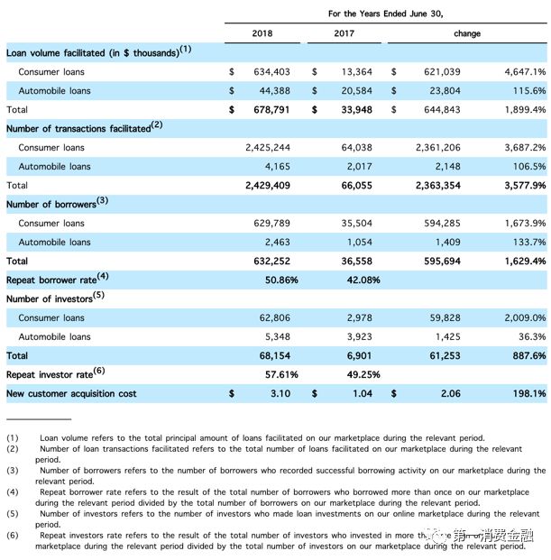 截至2017年6月30日财政年度,合众e贷的收入(revenue)为683万元,随后到2018年6月30日止财政年度,收入涨幅为3312.9%到达2.33亿元。截至2017年6月30日财政年度,合众e贷的净亏损(net loss)为567.8万元,随后到2018年6月30日止财政年度,净收益涨幅为608%到达2886.4万元。合众e贷重点提到消费贷款为其增长收入增长作出巨大贡献,截至2018年6月30日止财政年度,98.7%的收入增长由消费贷款贡献。