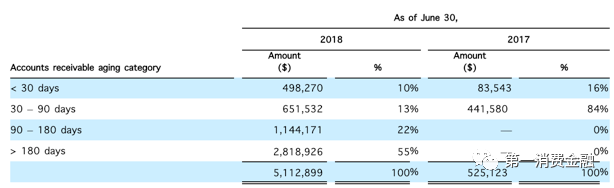 从应收账款总额的账龄(上图)来看,截止2018年6月30日财政年度,应收账款额2678.9万元应收账款超过90天,占比总营收账款比率为77%。
