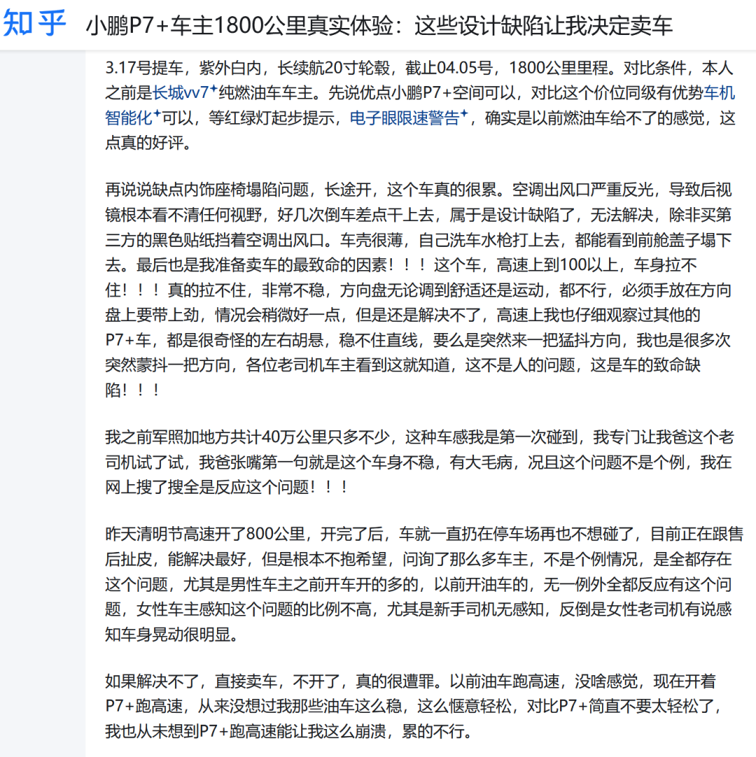早在2025年5月28日,一位小鹏P7+车主在知乎发文,描述其驾驶1800公里后的体验,直指转向系统存在严重问题。他提到,车辆在“高速上到100以上……真的拉不住,非常不稳,方向盘无论调到舒适还是运动,都不行”,且“稳不住直线”,甚至出现“突然来一把猛抖方向”的情况。该车主也仔细观察过高速上其他的P7+车,“都是很奇怪的左右胡悬,稳不住直线,要么是突然来一把猛抖方向。”其父亲试驾后表示,“这个车身不稳,有大毛病”。该车主最终决定卖车,称“这是车的致命缺陷!!!”
