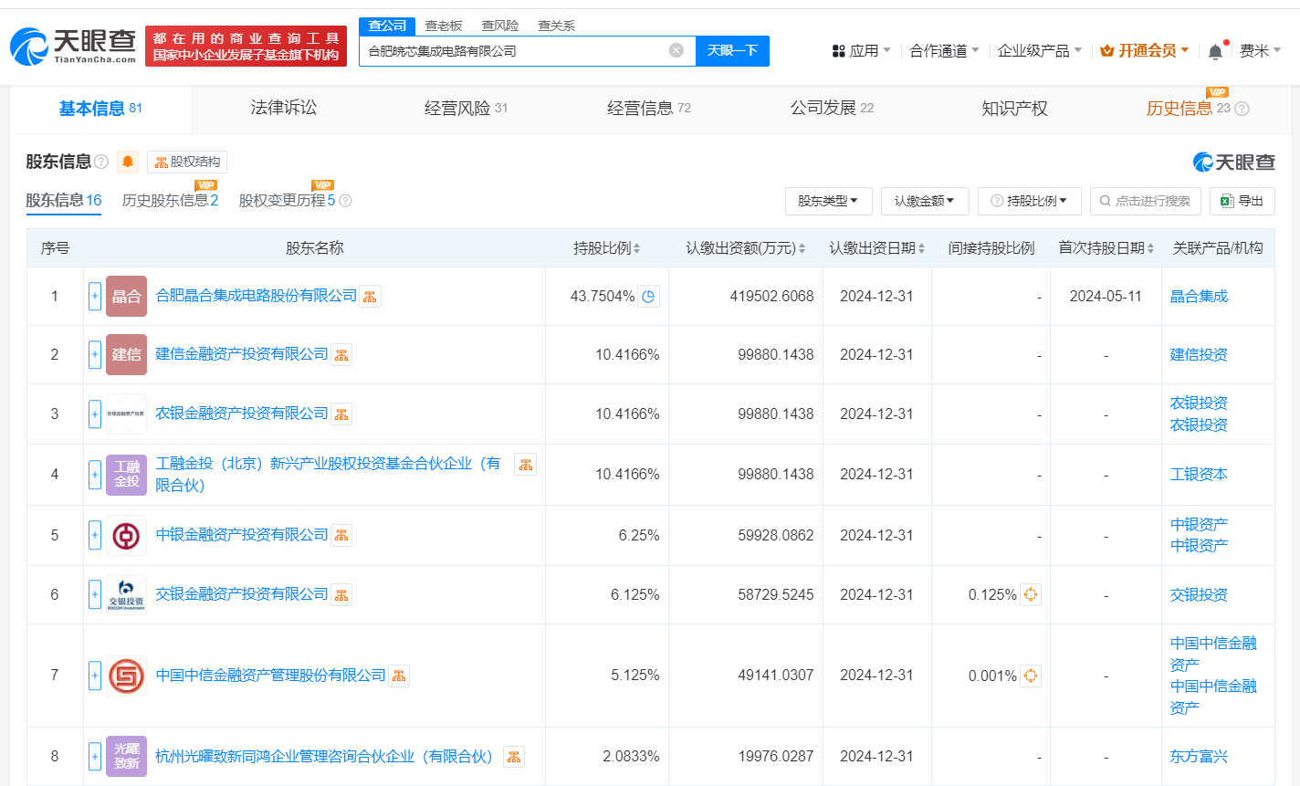 天眼查App显示,近日,合肥皖芯集成电路有限公司发生工商变更,新增建信金融资产投资有限公司、交银金融资产投资有限公司、工银投资旗下工融金投(北京)新兴产业股权投资基金合伙企业(有限合伙)等为股东,注册资本由约5000万人民币增至约95.9亿人民币,同时多位高管发生变更。
