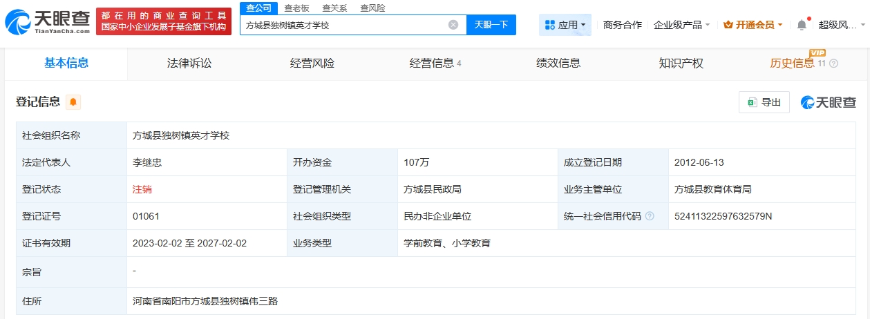 天眼查App显示,涉事的方城县独树镇英才学校成立于2012年6月,法定代表人为李继忠,开办资金107万人民币,业务类型为学前教育、小学教育,为民办非企业单位。目前,该学校登记状态为注销。