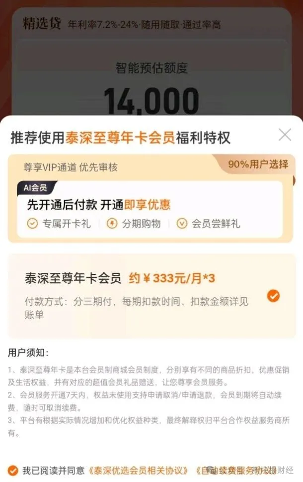据相关产品信息,泰深优选会员权益服务与贷款服务强关联。用户在申请金融服务时出现泰深至尊年卡会员营销页面,页面显著标明“尊享VIP通道”“优先审核”“90%用户选择”。会员权益费用分三期支付,三期会员费合计近千元,如果用户选择开通,还须同意自动续费服务协议。