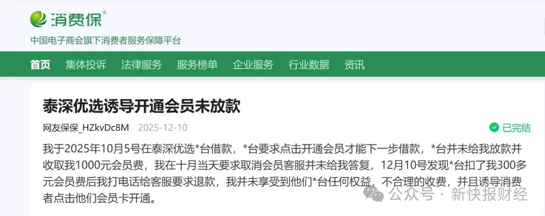 还有用户反映,在泰深优选平台申请借款,而平台以贷款为诱饵收取会员费。泰深优选同样被指存在开通会员才能申请借款的行为。
