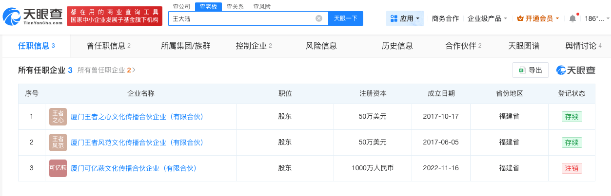 天眼查商业履历信息显示,王大陆名下共关联3家企业,其中2家为存续状态,包括厦门王者之心文化传播合伙企业(有限合伙)、厦门王者风范文化传播合伙企业(有限合伙),王大陆在上述企业中均持有股份。