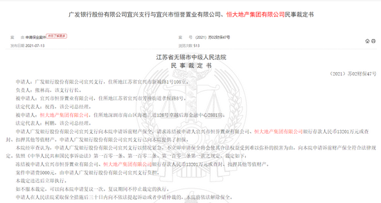 7月13日,根据裁判文书网,申请人广发银行股份有限公司宜兴支行向江苏省无锡市中级人民法院申请诉前财产保全,请求冻结被申请人宜兴市恒誉置业有限公司、恒大地产集团有限公司银行存款人民币13201万元或查封、扣押其他等值财产。申请人广发银行股份有限公司宜兴支行已向江苏省无锡市中级人民法院提供了担保。