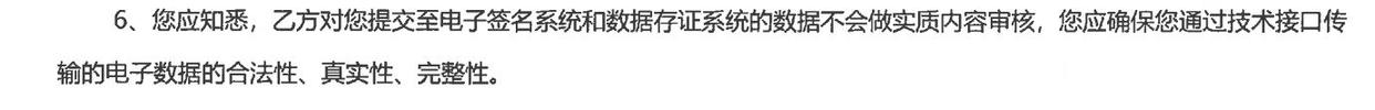 在2021版合同中,同样的条款出现在第4.2(6)条款中。另外,2021版合同所附风险提示函第6款条款为:您(牦牛科技)应知悉,乙方(e签宝)对您提交至电子签名系统和数据存证系统的数据不会做实质内容审核,您应确保您通过技术接口传递的电子数据的合法性、真实性、完整性。
