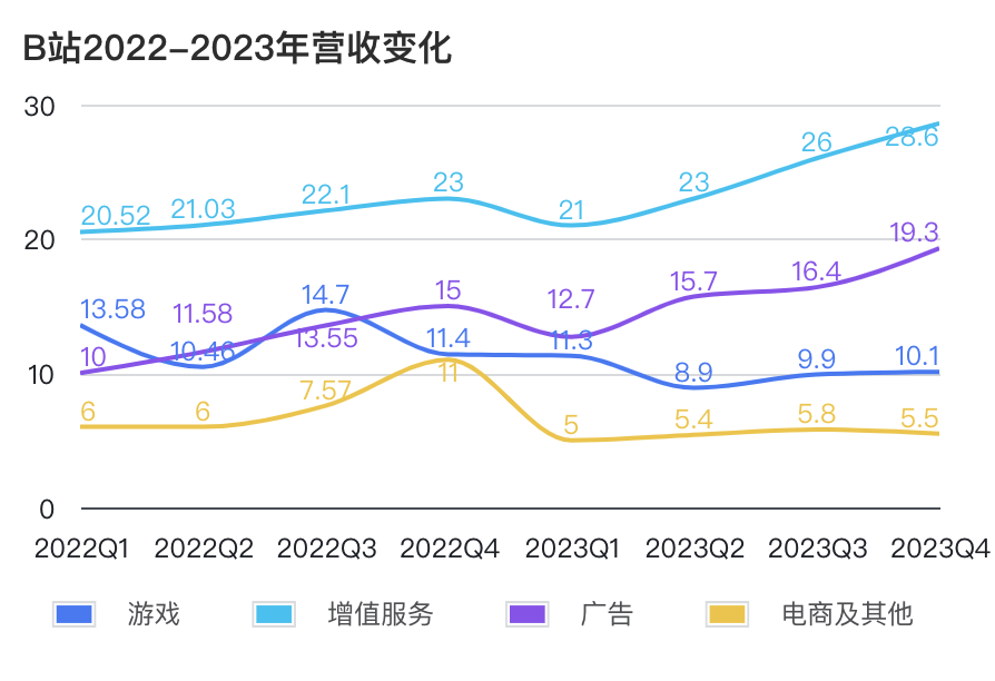 事实上,B站有相对多元的收入模式,包括游戏、广告、增值服务、电商等四大类,几乎覆盖了最主流的互联网商业模式,但问题是每一个赚钱能力都不强。