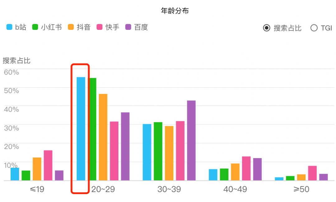 B站用户增长困境还跟其自身用户定位有关。年轻用户是B站的护城河,但也是B站规模增长的壁垒。百度指数可以从一个层面反映出B站用户的构成比例。在B站的用户中,20至29岁用户比例为55.3%,用户TGI远高于其他年龄人群,也高于其他产品。据财报数据,B站用户平均年龄24岁左右,Z世代用户覆盖率达到了65%。如果B站继续定位为年轻用户产品,那么1亿左右的DAU就很可能是他的天花板。