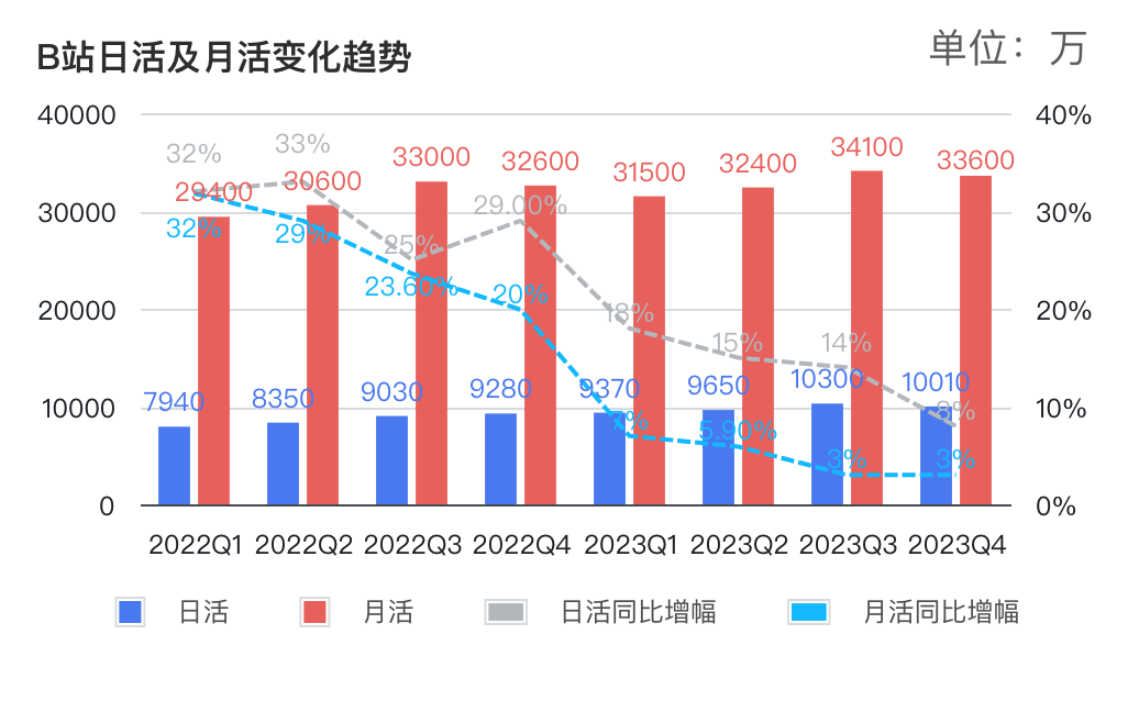 其带来的后果也很明显:B站用户数开始负增长。2023年四季度,B站用户日活1亿,月活3.36亿,双双环比下降。这也意味着B站过去的用户增长过于依赖营销费用,不够健康。