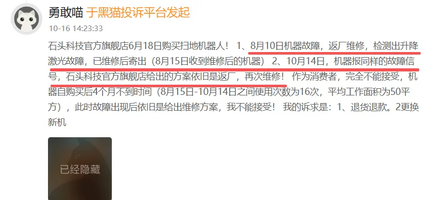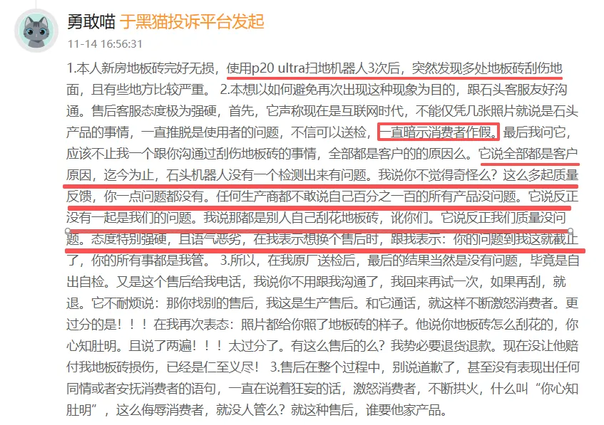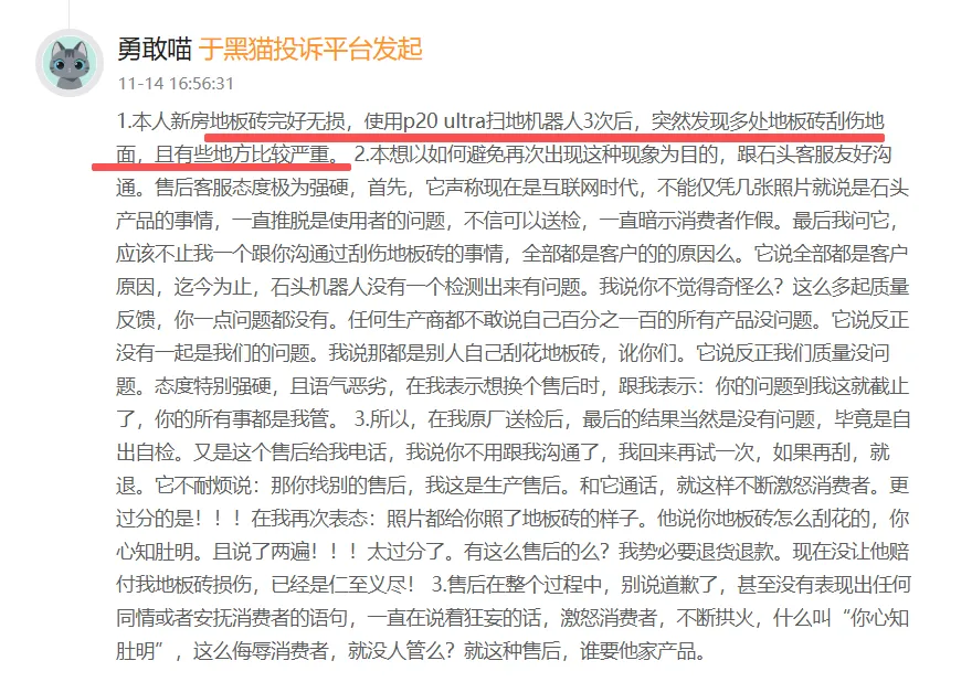 事实上,“对地板造成刮痕”问题只是石头科技众多投诉中的冰山一角。截至目前,黑猫投诉平台上,与“石头科技”相关的投诉总量已超过2700条,问题主要集中在产品质量与售后服务方面。