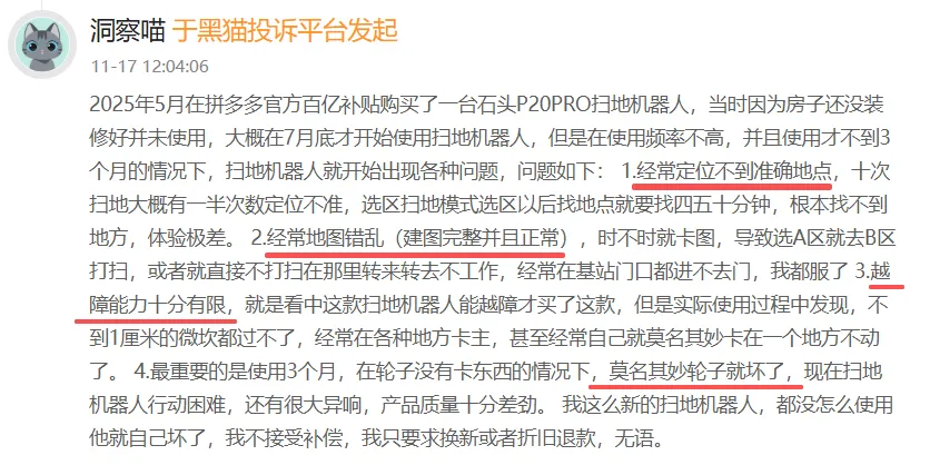 比如,11月17日,有用户投诉称,其购买的“石头P20 Pro”在使用不到三个月的情况下,出现多项故障,包括定位不准、地图错乱、越障能力差以及轮子异常损坏等问题;11月16日,有用户投诉“石头P20 Ultra”存在漏水及机器人模组异常,导致无法正常使用;一名消费者于10月16日反映,在石头科技官方旗舰店6月18日购买扫地机器人,8月10日、10月14日两次因机器故障,返厂维修……