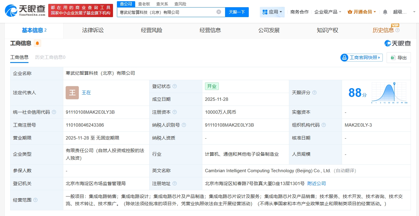 天眼查App显示,近日,寒武纪智算科技(北京)有限公司成立,法定代表人为王在,注册资本1亿人民币,经营范围包括集成电路设计、集成电路芯片及产品制造、集成电路芯片设计及服务等。股东信息显示,该公司由寒武纪(688256)全资持股。