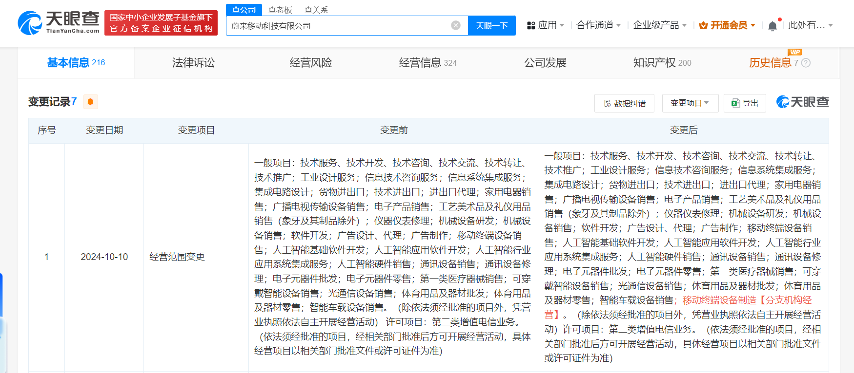 天眼查App显示,近日,蔚来移动科技有限公司发生工商变更,经营范围新增移动终端设备制造(分支机构经营)业务。