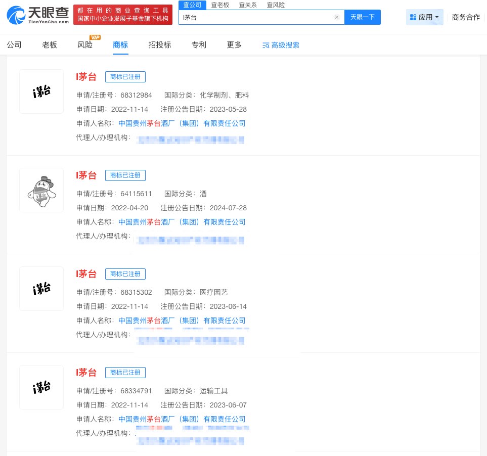 天眼查知识产权信息显示,中国贵州茅台酒厂(集团)有限责任公司已申请注册多枚“I茅台”商标,国际分类涉及酒、医疗园艺、运输工具等,上述商标状态多为已注册。