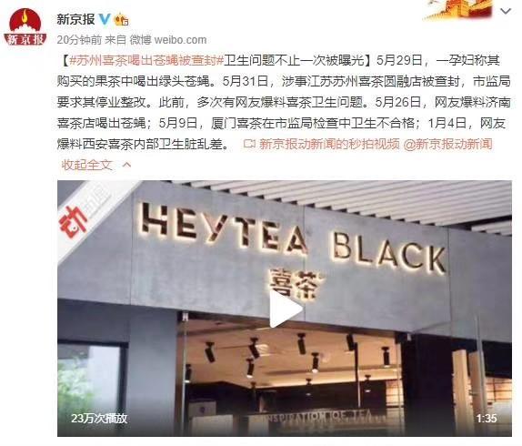 5月31日晚,新京报、每日经济新闻等多家媒体微博报道,喜茶苏州圆融店因卫生问题被执法部门责令停业整顿。苏州市人民政府新闻办公室官方微博“苏州发布”推送的微博称,一位孕妇在喜茶苏州圆融广场分店喝到绿头苍蝇,对此喜茶方面表示“未发现之所过程中有苍蝇进入,且由于上述顾客购买方式为外卖,且已经过去4小时,因此途中有很多不可控因素。”