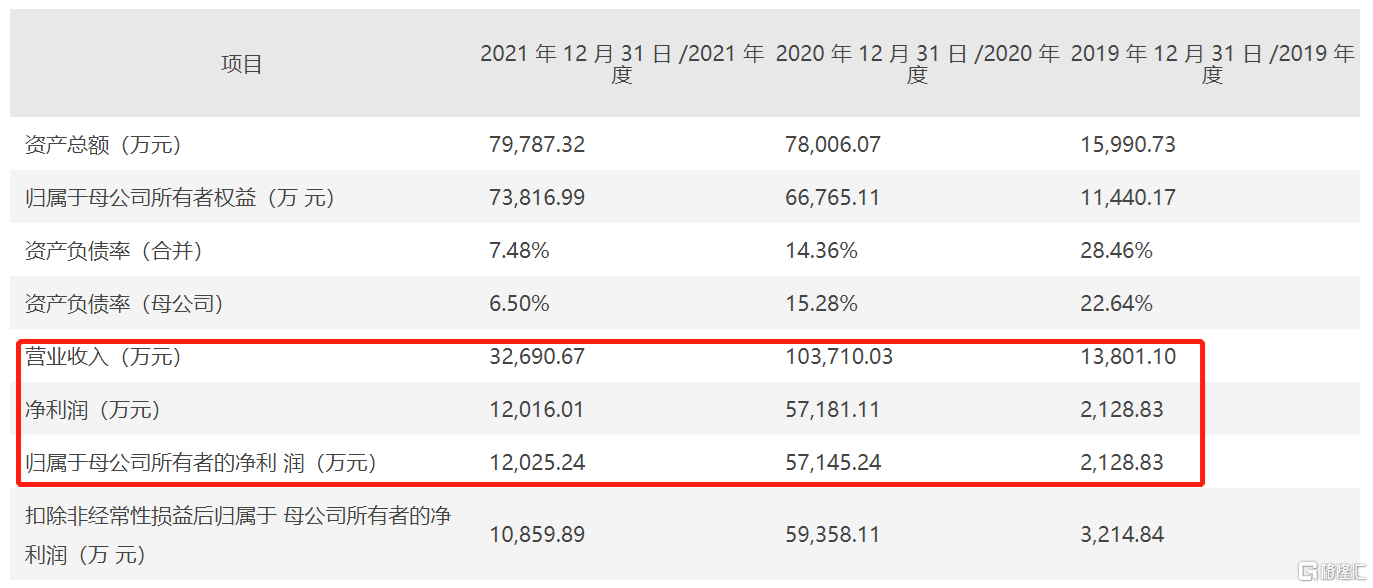 2019年至2021年,公司营收分别为1.38亿元、10.37亿元和3.27亿元,对应的归母净利润分别为2128.83万元、5.71亿元和1.20亿元,存在较大的波动。2020年、2021年,公司分别进行现金分红1.0亿元、5000万元。