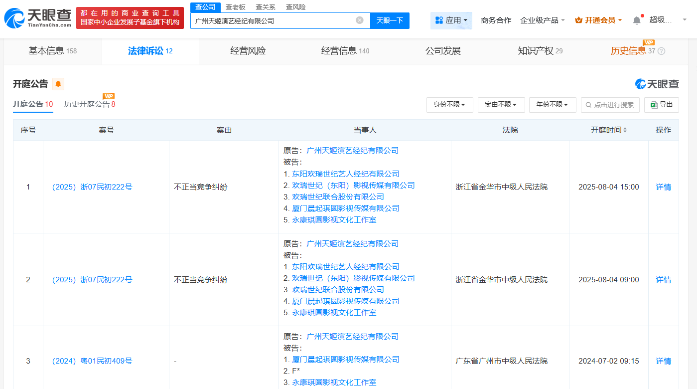 天眼查App显示,近日,傅诗淇(成毅)名下厦门晨起琪圆影视传媒有限公司、永康琪圆影视文化工作室及其经纪公司欢瑞世纪联合股份有限公司、东阳欢瑞世纪艺人经纪有限公司、欢瑞世纪(东阳)影视传媒有限公司新增1条开庭公告,原告为广州天姬演艺经纪有限公司,案由为不正当竞争纠纷,该案将于8月4日在浙江省金华市中级人民法院开庭审理。