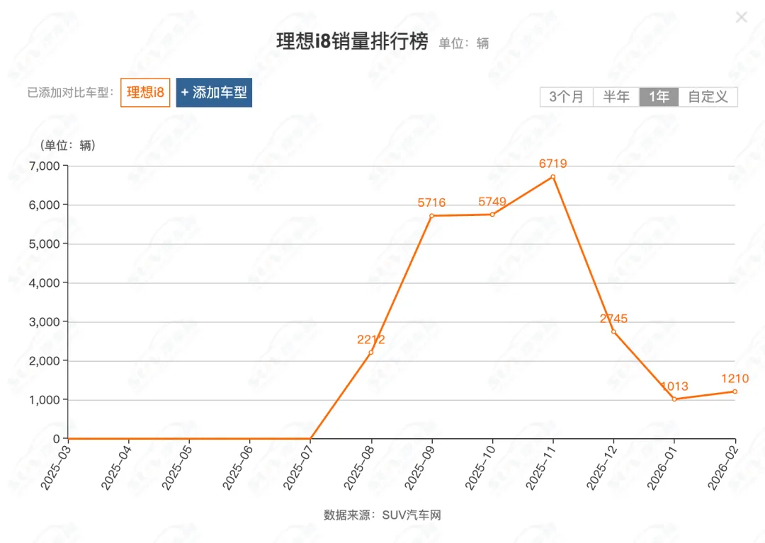 然而遗憾的是,由于30万级六座纯电SUV赛道蛰伏着乐道L90、问界M8纯电版、特斯拉Model YL等实力强悍的竞品,理想i8并未一炮而红。SUV汽车网披露的数据显示,理想i8的销量于2025年11月攀升至6719辆的高点后一路下行,2026年1-2月仅为1000辆左右。
