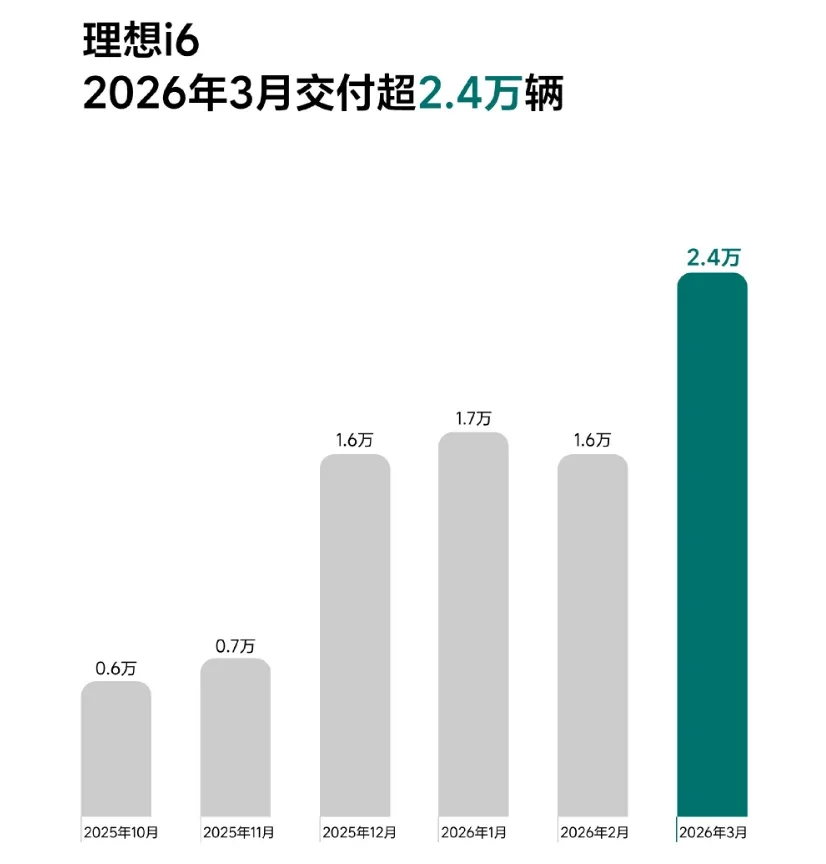 2026年3月,理想i6销量进一步攀升至2.4万辆,环比增长50%,同期,理想汽车交付量为4.11万辆,不光环比增长55.38%,同比也增长11.94%。