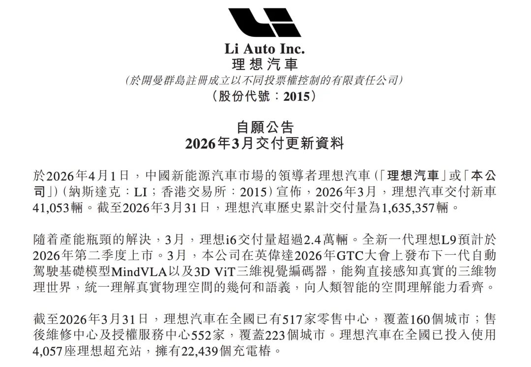 2026年4月1日,理想汽车披露2026年3月交付数据,交付新车约4.11万辆,同比增长11.94%,环比增长55.38%。