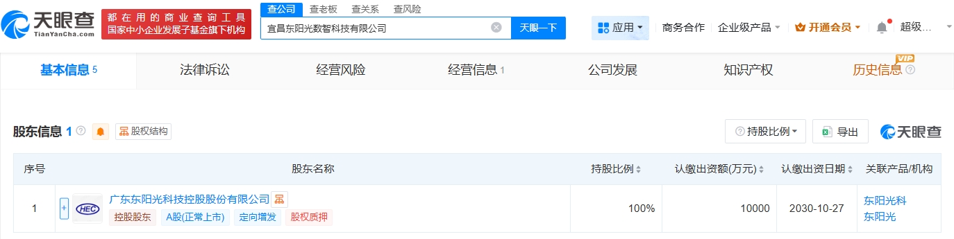 天眼查App显示,近日,宜昌东阳光数智科技有限公司成立,法定代表人为胡来文,注册资本1亿人民币,经营范围包括工业互联网数据服务、互联网数据服务、互联网安全服务、云计算装备技术服务等。