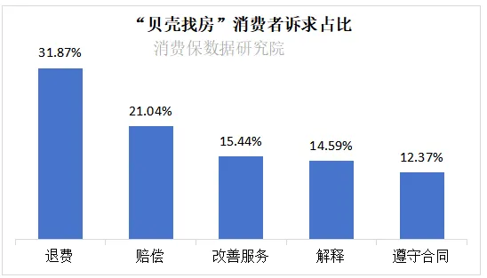 在“贝壳找房”消费者诉求中,退费诉求以31.87%的占比位居首位;紧随其后的是赔偿(21.04%)、改善服务(15.44%)。