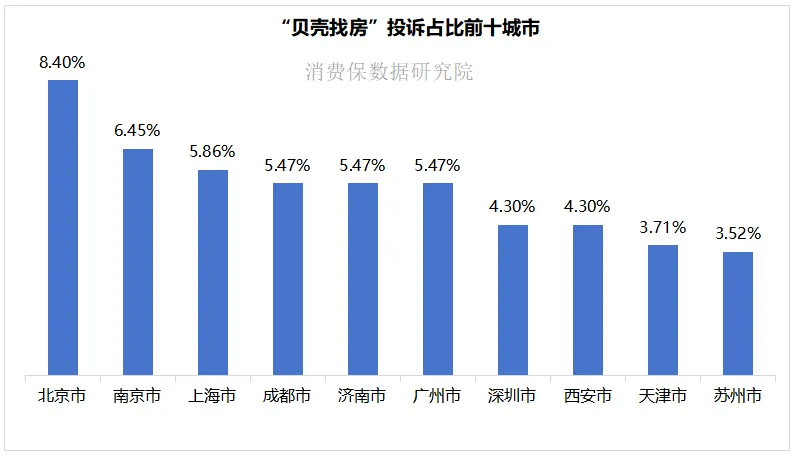“贝壳找房”投诉用户地域分布中,北京市以8.40%的占比位居首位,南京市(6.45%)、上海市(5.86%)紧随其后。主要分布在一线城市及部分重点新一线城市,一方面说明这些城市交易活跃度高、住房消费需求旺盛,另一方面也反映了其消费维权意识更高。