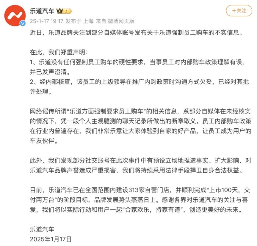 1月17日,“乐道品牌”微博官方账号发布声明称:不实信息,“乐道没有任何强制员工购车的硬性要求,当事员工对内部购车政策理解有误,并已发声澄清。”