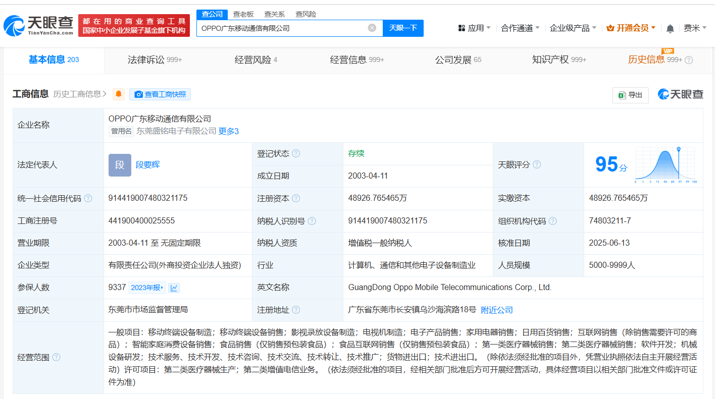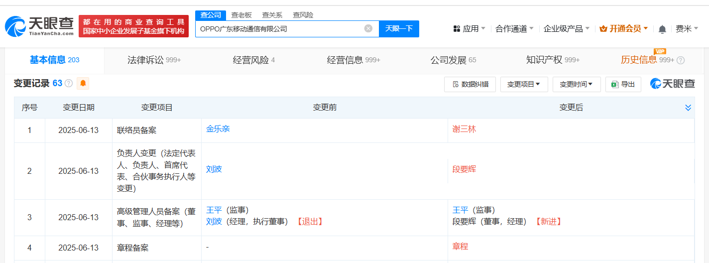天眼查App显示,近日,OPPO广东移动通信有限公司发生工商变更,刘波卸任法定代表人、执行董事、经理,段要辉接任法定代表人、经理,并担任董事职位。