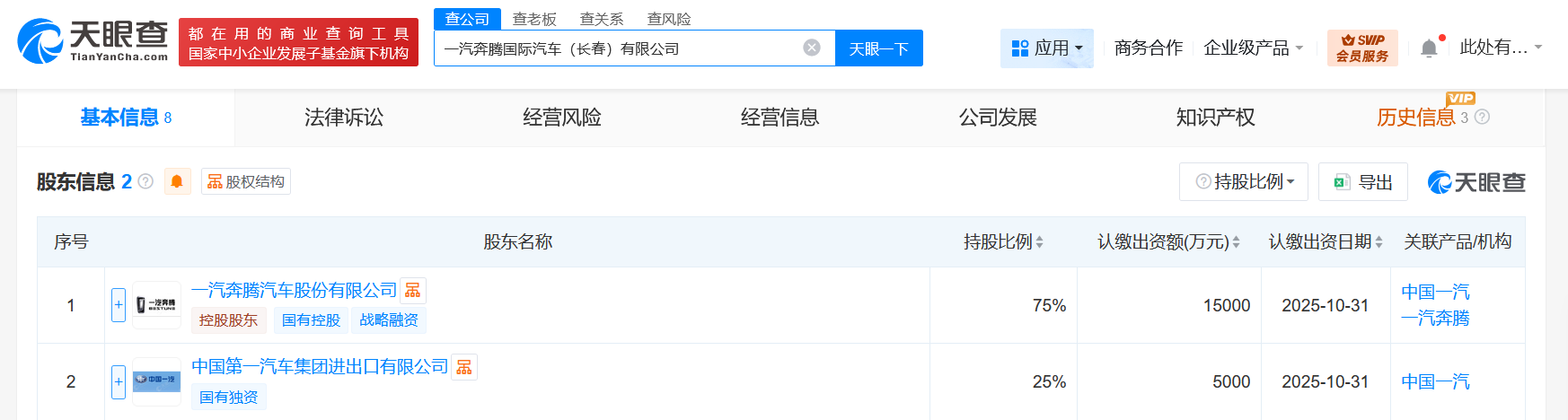 天眼查工商信息显示,近日,一汽奔腾国际汽车(长春)有限公司成立,法定代表人为杨晓锋,注册资本2亿人民币,经营范围含汽车销售、货物进出口、技术进出口、进出口代理、汽车零配件批发、新能源汽车整车销售、二手车经纪、新能源汽车电附件销售、新能源汽车换电设施销售、新能源汽车生产测试设备销售等。股东信息显示,该公司由一汽奔腾汽车股份有限公司、中国第一汽车集团进出口有限公司共同持股。