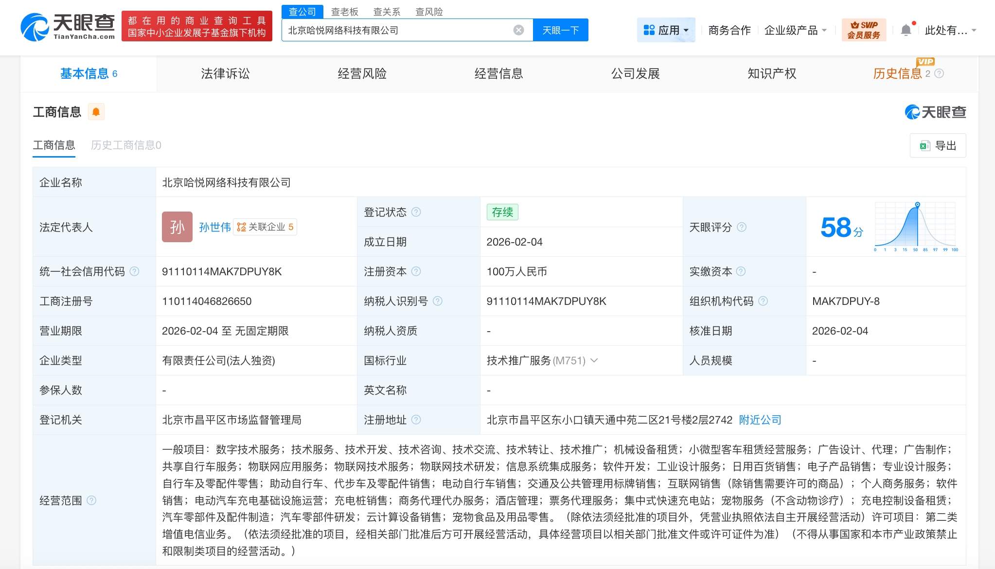 天眼查工商信息显示,近日,北京哈悦网络科技有限公司成立,法定代表人为孙世伟,注册资本100万人民币,经营范围含数字技术服务、信息系统集成服务、工业设计服务、电动汽车充电基础设施运营、充电桩销售、商务代理代办服务、票务代理服务等。