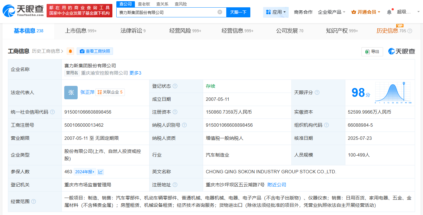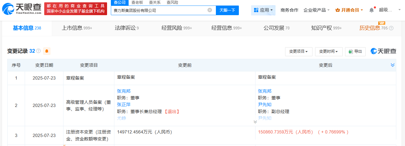 天眼查App显示,近日,赛力斯(601127)发生工商变更,注册资本由约14.97亿人民币增至约15.09亿人民币。