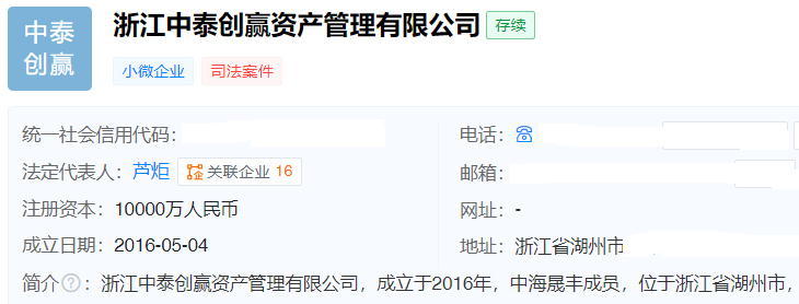 天眼查显示,中泰创赢成立于2016年5月4日,注册资本1亿元,法定代表人芦炬。