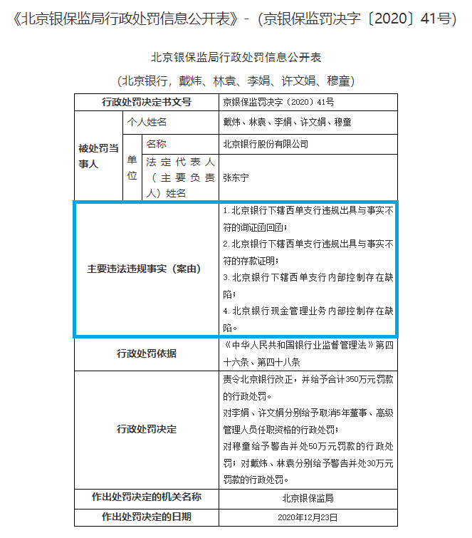 2020年12月23日,北京银保监局向北京银行及戴某、林某、李某、许某娟、穆某开出了一张罚单,原因是北京银行下辖西单支行“违规出具与事实不符的询证函回函、违规出具与事实不符的存款证明、内部控制存在缺陷”,同时北京银行“现金管理业务内部控制存在缺陷”。最终,北京银行被责令改正并罚款350万元,李某、许某娟等人分别受到警告及罚款。